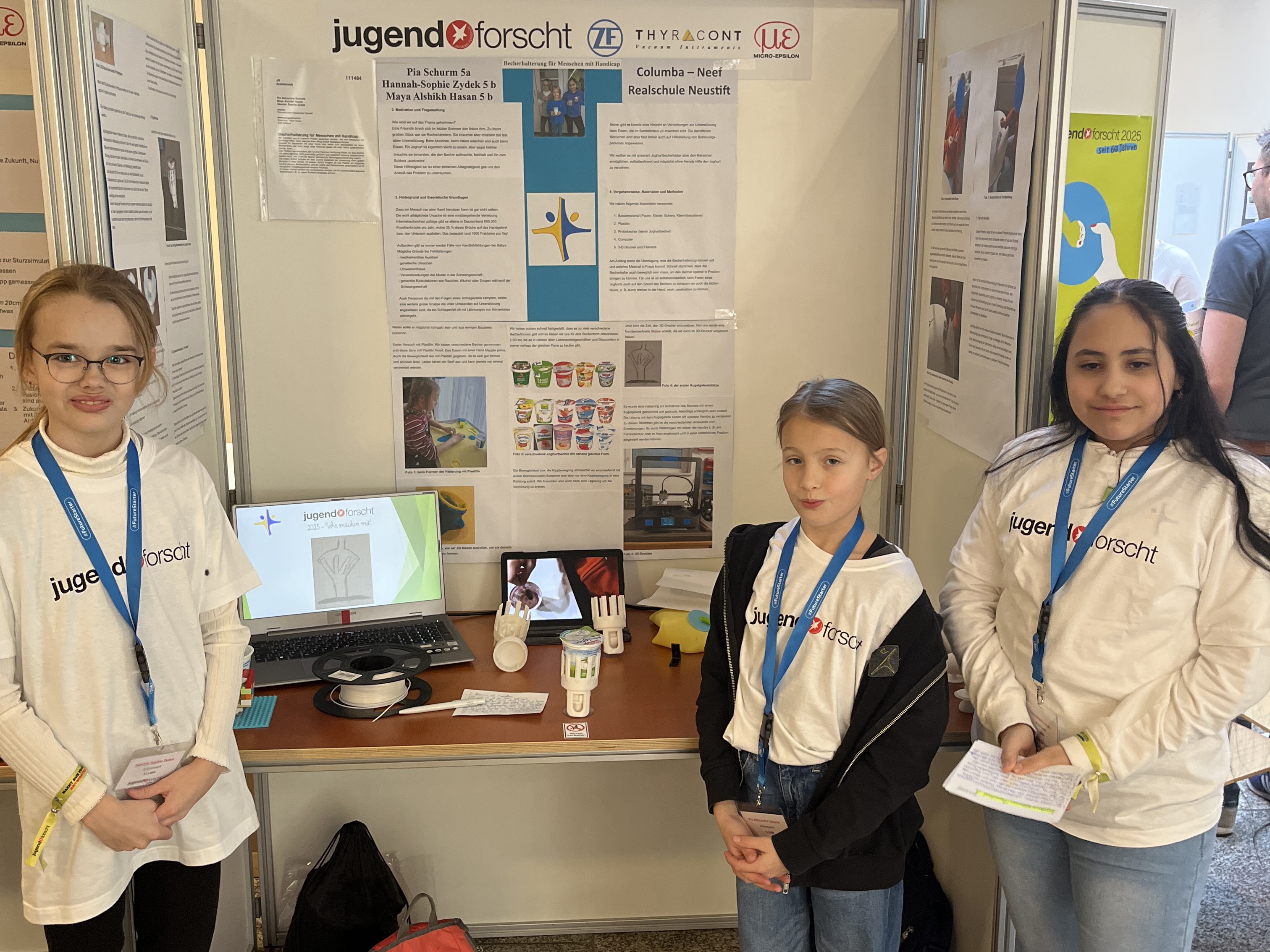 Die Jury war von der Arbeit so beeindruckt, dass die Jungforscherinnen zu Regionalsiegern in der Sparte Schüler experimentieren im Bereich Geo- und Raumwissenschaften gekürt wurden. Zudem erhielten sie den Sonderpreis „Umwelttechnik“, der von der deutschen Bundesstiftung Umwelt bereitgestellt wurdeIm Bereich Arbeitswelt arbeitete die zweite Schülerinnengruppe der Columba-Neef Realschule an einer Becherhalterung für Menschen mit Handicap. Pia Schurm, Klasse 5a, Hannah-Sophie Zydek und Maya Alshikh Hasan, beide Klasse 5b, machten sich in den letzten Monaten Gedanken darüber, wie man Menschen mit Handicap helfen kann, dass sie ihren Alltag besser bewältigen können. Speziell für Menschen mit nur einer Hand oder einem Arm entwickelten sie einen Becherhalter, der dafür sorgen soll, dass Nahrung einfacher mit einer Hand aufgenommen werden kann. Als ersten Schritt fertigten die Schülerinnen einen groben Bauplan in einer Skizze an, den sie Schritt für Schritt verfeinerten. In der zweiten Stufe fertigten sie aus Plastilin ein mögliches Modell eines Becherhalters an, den sie abschließend mit Hilfe eines 3D-Drucker präsentieren konnten. Die Jury war ebenfalls sehr beeindruckt und vergab den drei Mädels den Regionalsieg in der Sparte Schüler experimentieren im Bereich Arbeitswelt