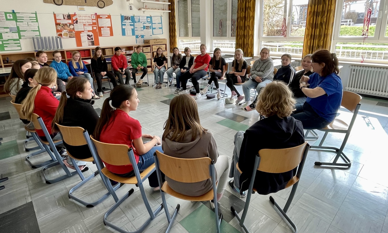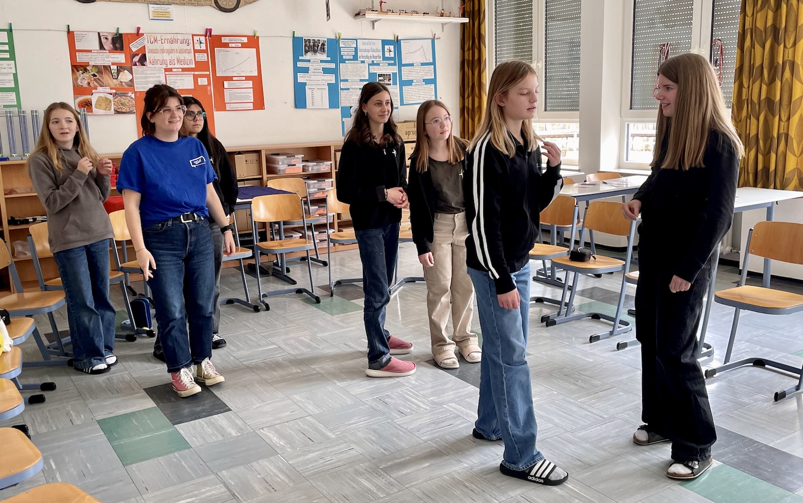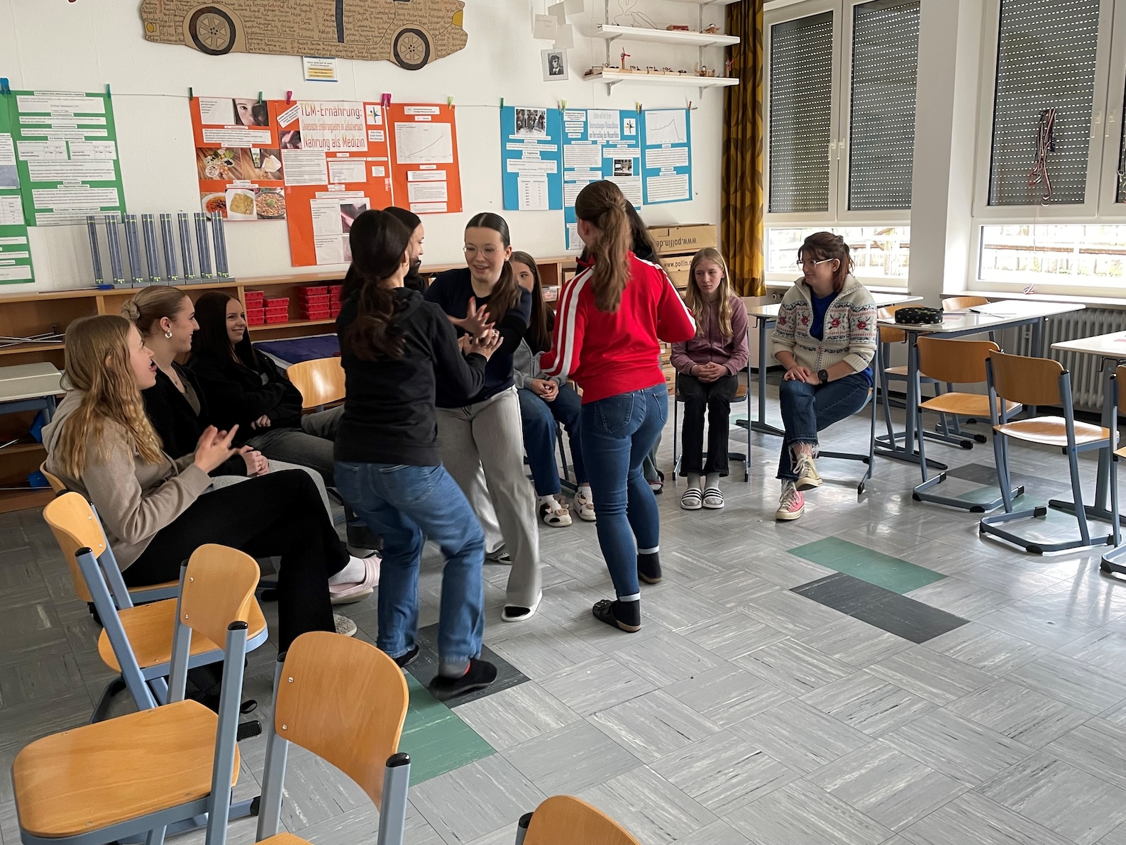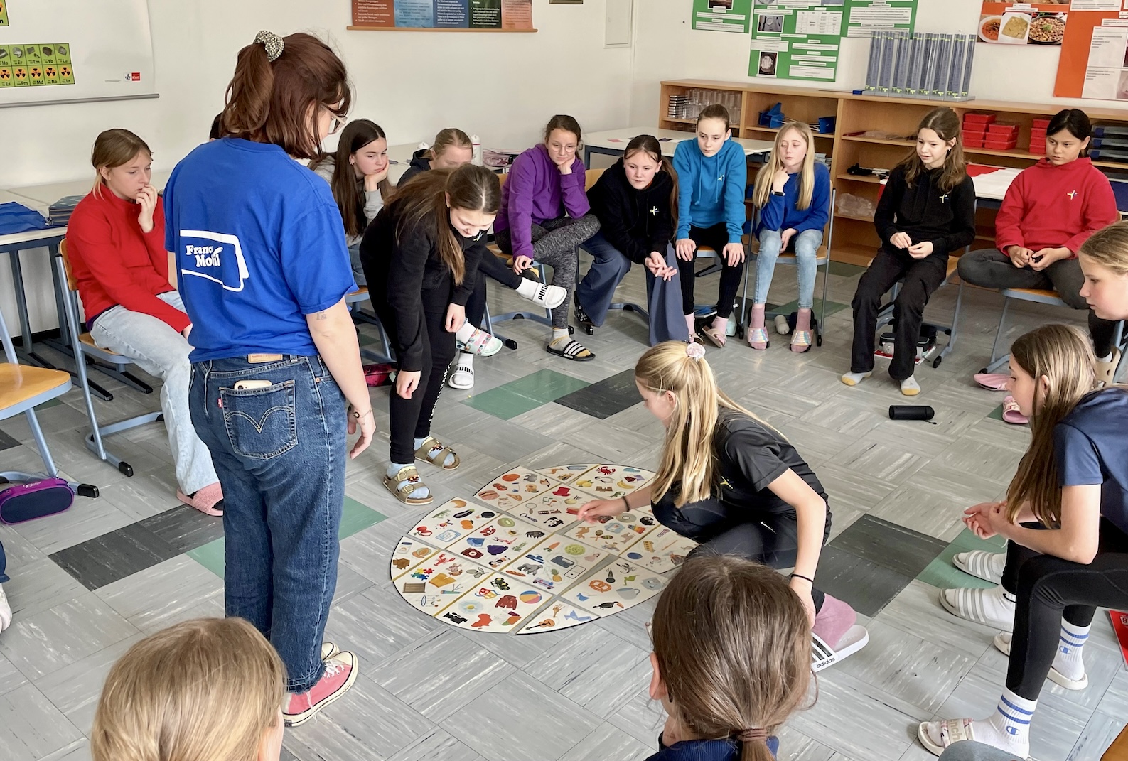 Der Tag begann mit den Französisch-Schülerinnen der Klasse 8 b, die mit ihrem Temperament und ihrer ansteckend guten Laune die Spielanweisungen von Laurine sofort umsetzten und aus dem 45-minütigen Französischpowerlernen ein richtig lustiges Event machten, eine Schulstunde voller französischer Lebensfreude, in der die Zeit wie im Flug verging. Die Mädchen waren von Laurine und ihren Spielideen so begeistert, dass sie am Ende als kleines Dankeschön für Laurine noch ihren selbst einstudierten, sehr sehenswerten und äußerst flotten französischen Tanz aufführten. Das war „fantastique“ - Wow!
