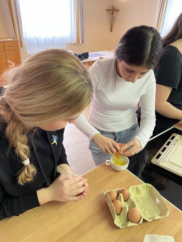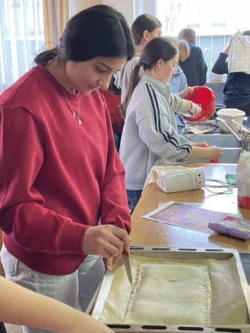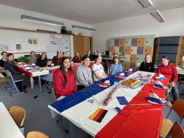 Damit die deutsch-französische Freundschaft in den Gedanken und in den Herzen der Schülerinnen präsent und lebendig bleibt, wurde in der Columba – Neef – Realschule eine schwungvolle Geburtstagsparty inszeniert. Die Französisch-Schülerinnen aus allen Jahrgangstufen brachten am Freitag, den 23.01., in der halbstündigen Pause am Vormittag allen Schülerinnen das französische Flair und Lebensgefühl nahe: Nach der Präsentation des tief berührenden Versöhnungsliedes „Göttingen“ von Barbara stellte Sima, die am deutsch-französischen Tag ihren eigenen Geburtstag feiern konnte, ihr Lieblingslied von Indila vor. Die 9. Klasse präsentierte mit Gitarrenbegleitung durch ihren Musiklehrer „Je ne parle pas franςais, aber bitte sprich weiter …“ von Namika – und alle Schülerinnen in der Pausenhalle stimmten laut und fröhlich in dieses Lied mit ein. Jede Französisch-Schülerin der 10. Klasse fasste die Bedeutung der deutsch-französischen Freundschaft in einem Wort zusammen. Alles fand vor dem Hintergrund von Schautafeln statt, deren Plakate bereits am Donnerstag, den 22.01. von der 9. Klasse gestaltet wurde: Hier konnte man die Geschichte, die Bedeutung und die gesamte Tragweite des berühmten Elysée-Vertrages nachverfolgen. Nicht zu kurz kam der kulinarische Aspekt – wie soll es auch anders sein, wenn man sich mit Frankreich beschäftigt!